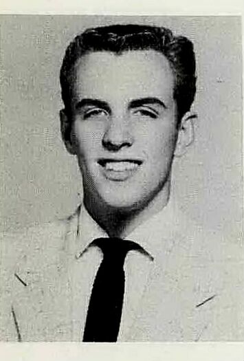 In the course of a misspent youth, crowded with swimming at Huntington Beach, lifeguarding at the Montebello Natatorium, and skiing in the Sierras, Bill managed to acquire the credits necessary for graduation from California's institutions of secondary learning. Here at USNA, Bill was able to keep his grades above average, and to stand near the top of his class in physical training. His afternoons were filled by company 150-pound football in the winter, and yawl sailing in the spring and fall. After graduation, Bill plans to return to his beach boy role, on the white sands bordering Navy's cradle of aviation.